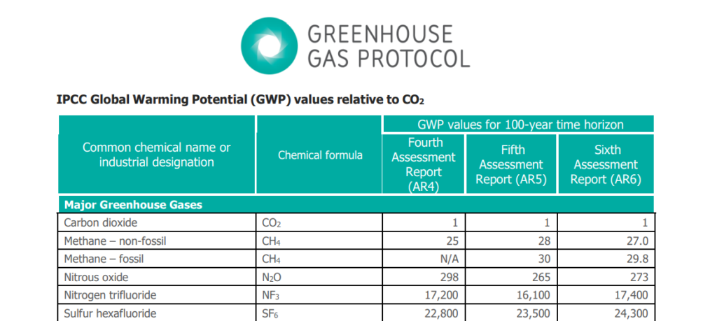 如下圖,以最廣泛使用的時間範圍100年為例,其 AR4、AR5、AR6版本的GWP不同。