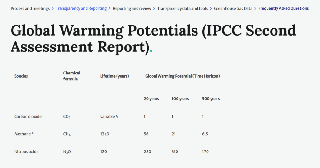 例如,根據以下資訊 (IPCC AR2),甲烷CH4 短期影響大,但壽命短,20年的 GWP 故比 100年高。